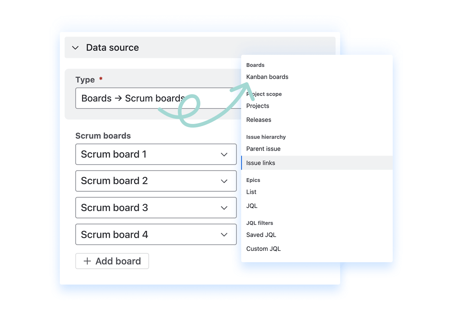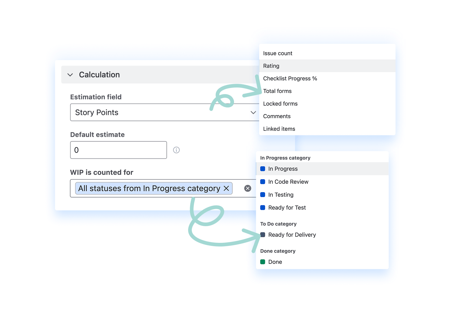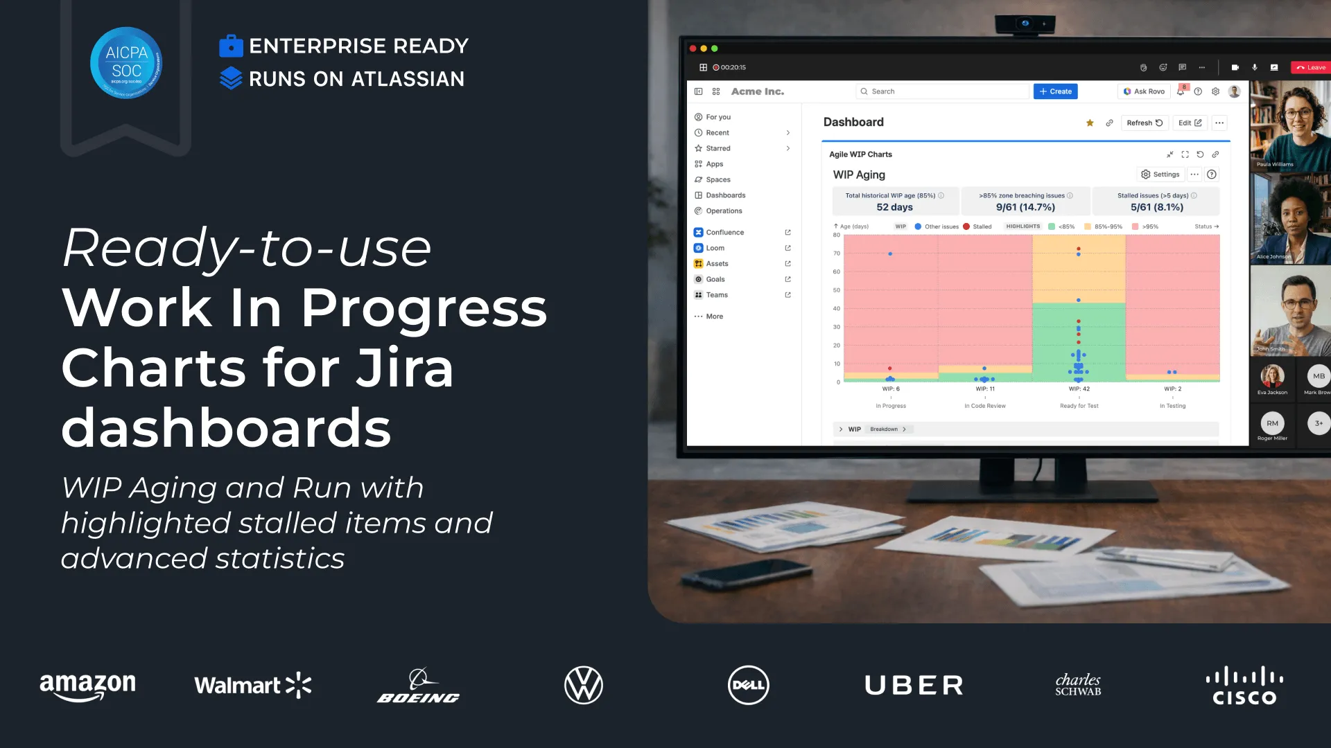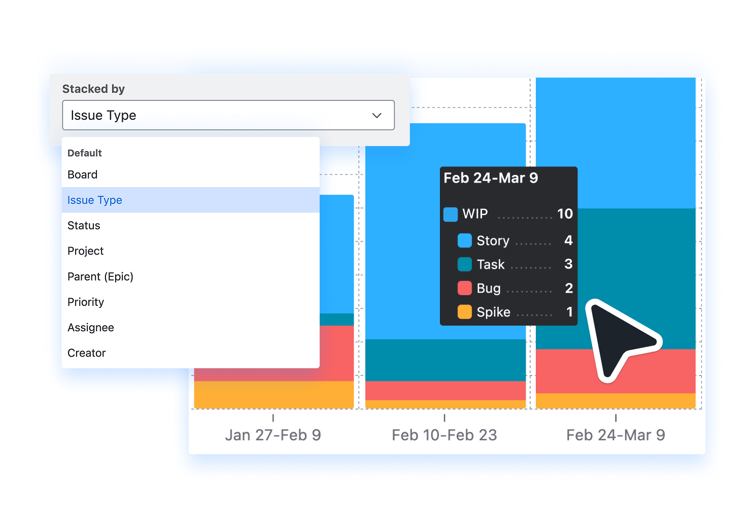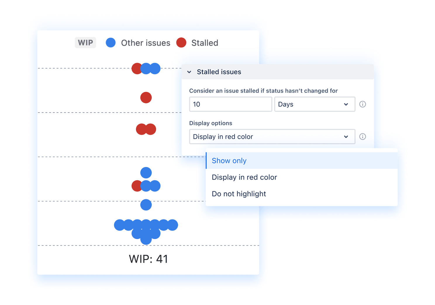Break down data by team, assignee, issue type, release, JQL, etc., and other fields, and drill down to issue-level insights. Use the WIP Aging chart to compare in-progress and historical (completed) work, or the WIP Run chart to analyze all issues within scope.