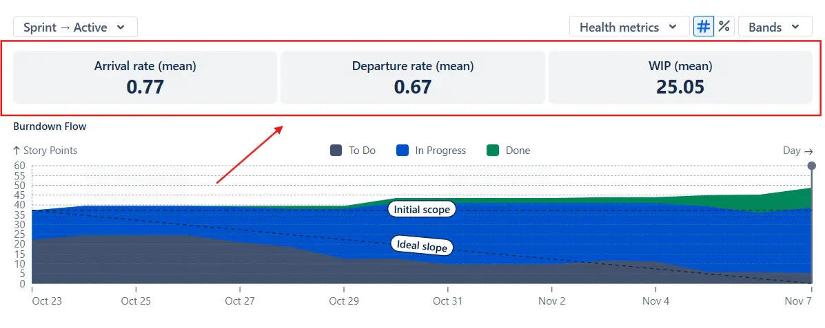 The health tiles above the chart summarize the most crucial flow indicators for the sprint: Arrival rate, Departure rate, and WIP: