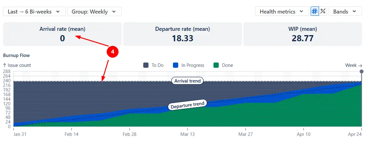 In example B, the Arrival line is flat, and the Arrival rate is 0 (4️⃣). This can be normal if the team is finishing a project and intentionally not pulling new work.
