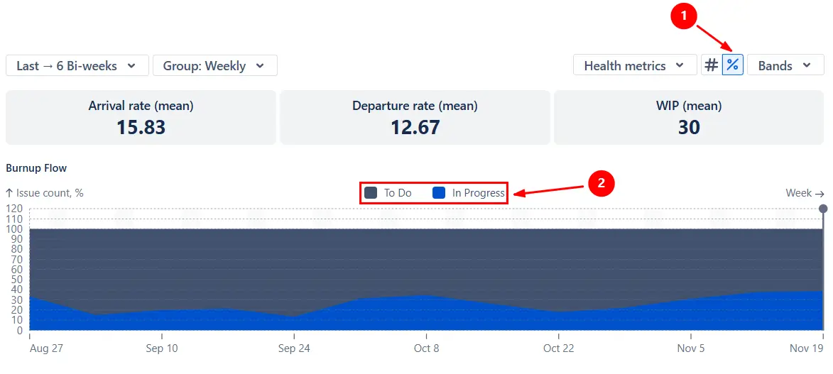 Switch the chart to percentage view (1️⃣) and hide the To Do band (2️⃣) to focus on the relative size of the active queue.
