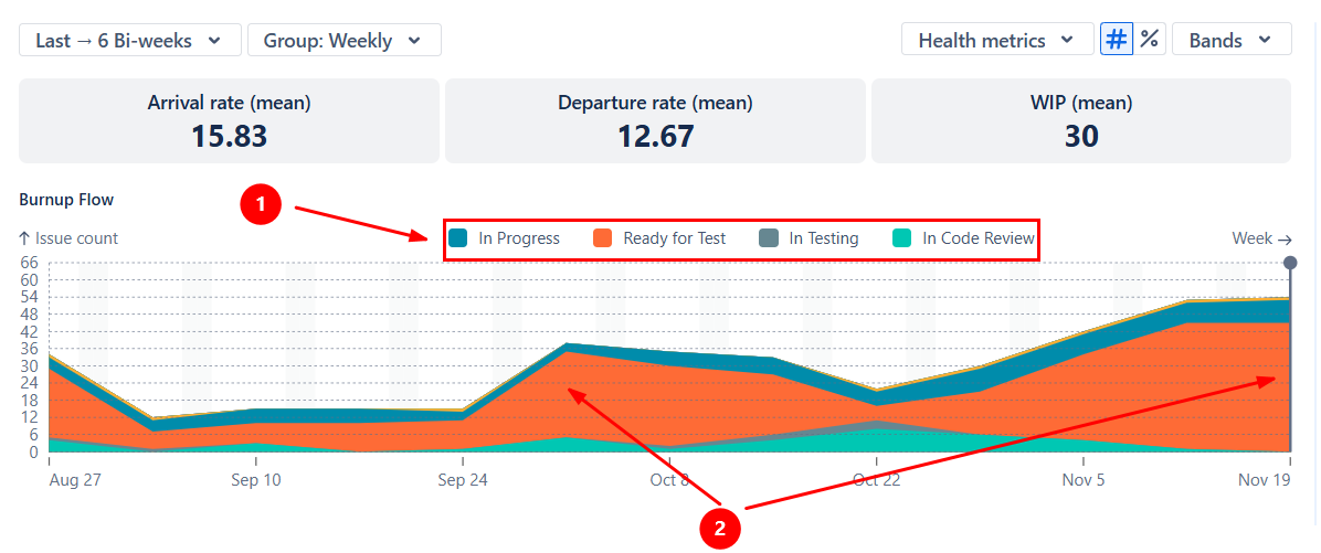 The colored bands represent the high-level categories of work (To Do, In Progress, Done) (1️⃣): the steeper a band grows, the more work is added to that category. Enable trend lines (2️⃣) to get a clearer picture of your workflow health. In a stable system, Arrival and Departure trend lines run roughly in parallel, meaning the team completes work at the same rate it receives it.