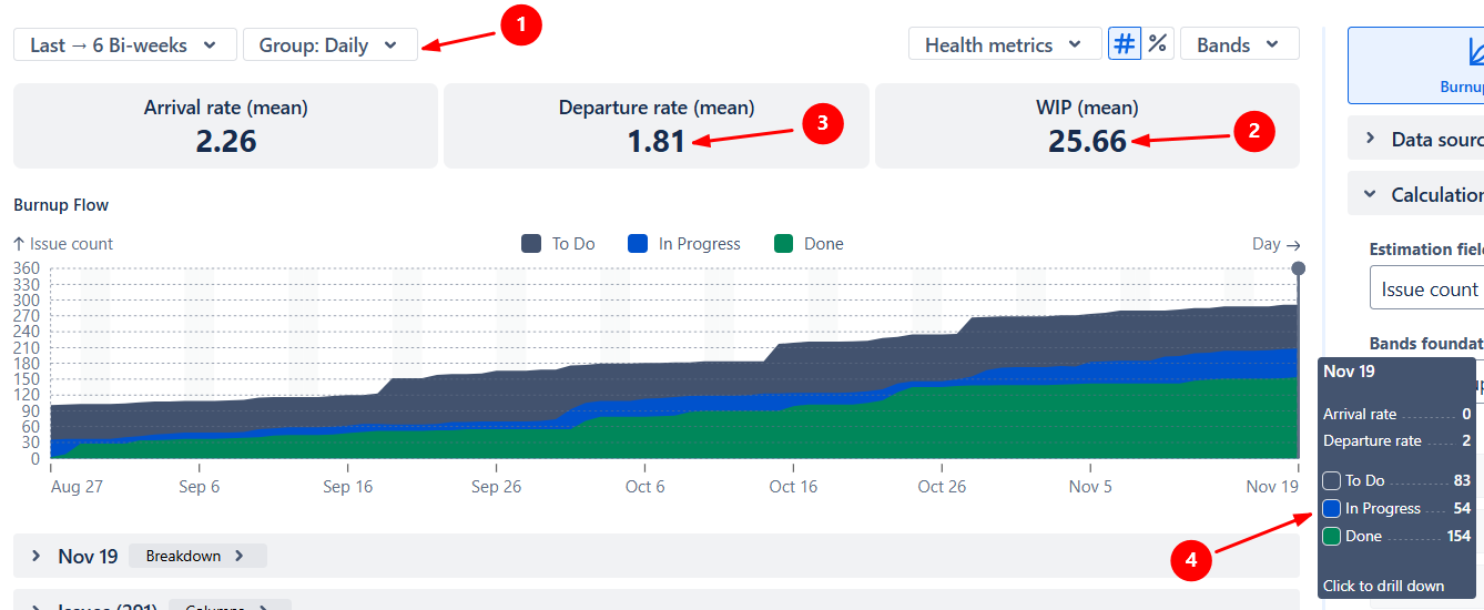 In the example below, the chart is grouped by day (1️⃣), and the average daily WIP is 25.66 issues (2️⃣), which is significantly higher than the average daily Departure rate (3️⃣). On November 19, WIP peaks at 54 In Progress issues (4️⃣), signaling clear overloading that requires immediate action.