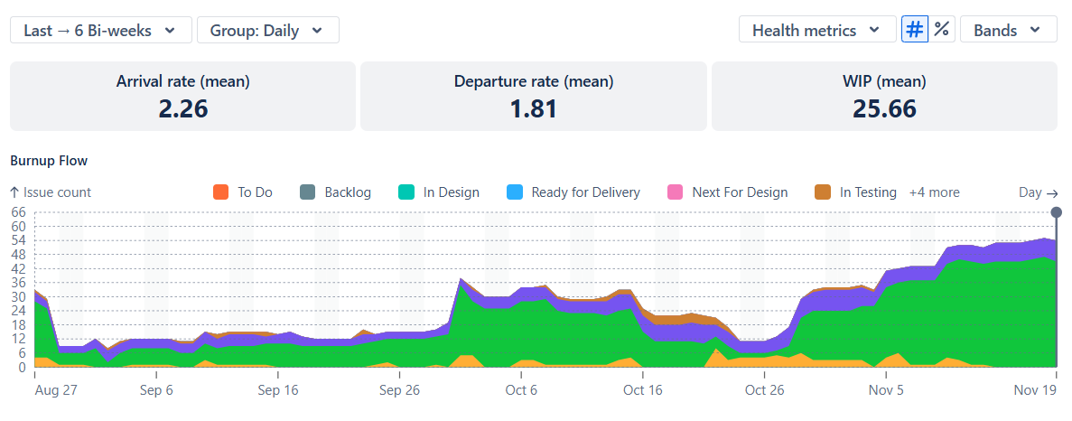 To make it easier to see how WIP moves across individual workflow stages, switch the chart to status-level bands and hide To Do and Done. This creates a simplified WIP view similar to a dedicated WIP Run chart: