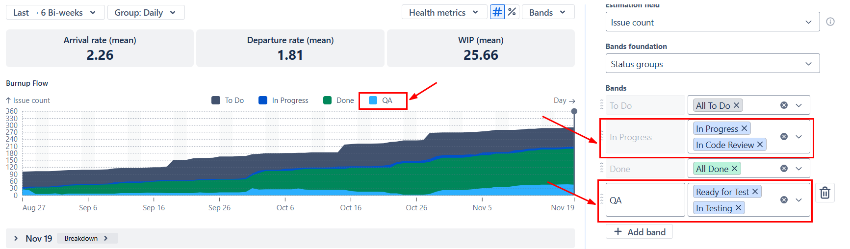 You can tailor how work is stacked on the Kanban Cumulative Flow Diagram. Select which statuses belong to the To Do, In Progress, or Done bands, or create custom bands to highlight specific workflow stages: