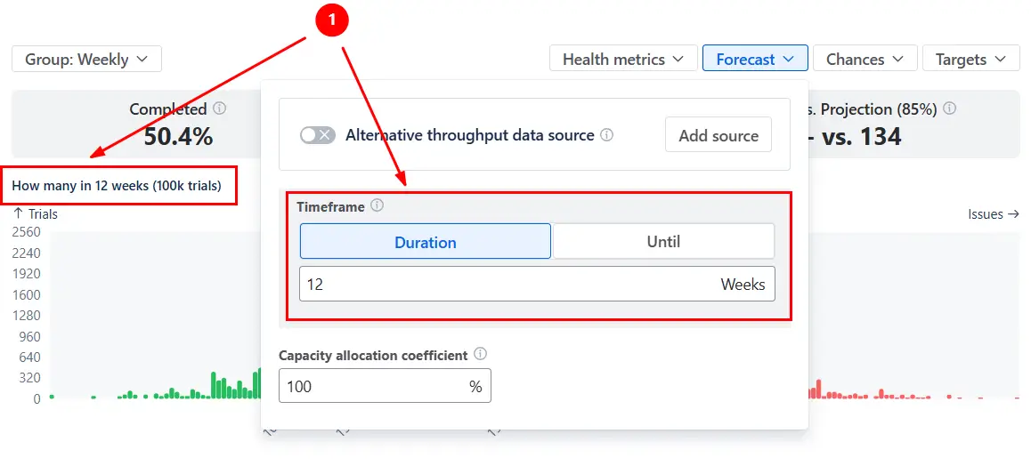 The example below models how many items could be completed over the next 12 weeks (1️⃣) based on the team’s historical weekly throughput:
