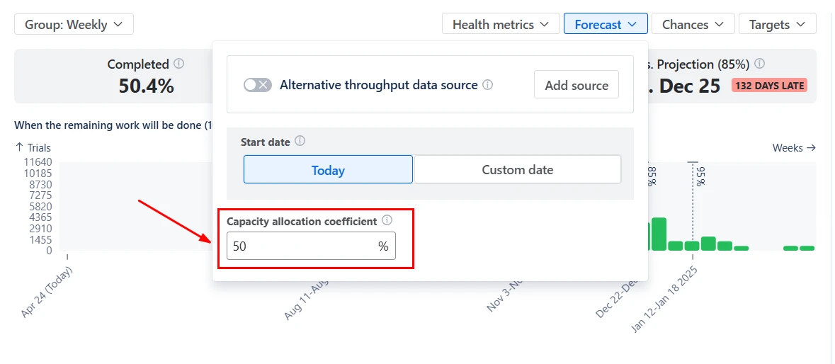 The Capacity allocation coefficient lets you model how much of the team’s throughput is dedicated to this scope. 100% assumes full focus, while 50% simulates a team splitting time across initiatives.