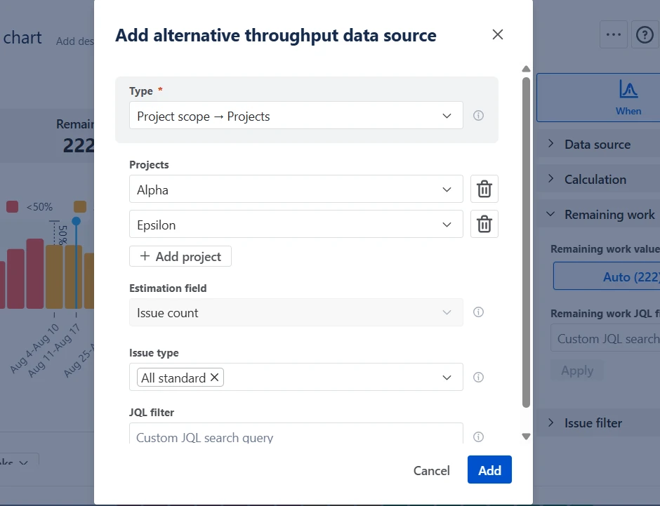 With the Alternative throughput data source option, you can decouple the scope from the throughput history used for simulation. Instead of sampling delivery rates from the current selection, the chart can use throughput from another Kanban board, project, or release.