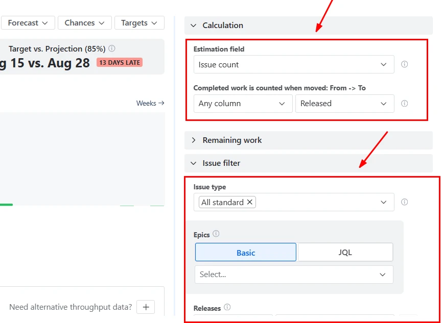 By default, remaining work equals the number of unresolved items in the selected Kanban boards. However, you can enter a custom “What-if” value or filter the backlog using JQL.