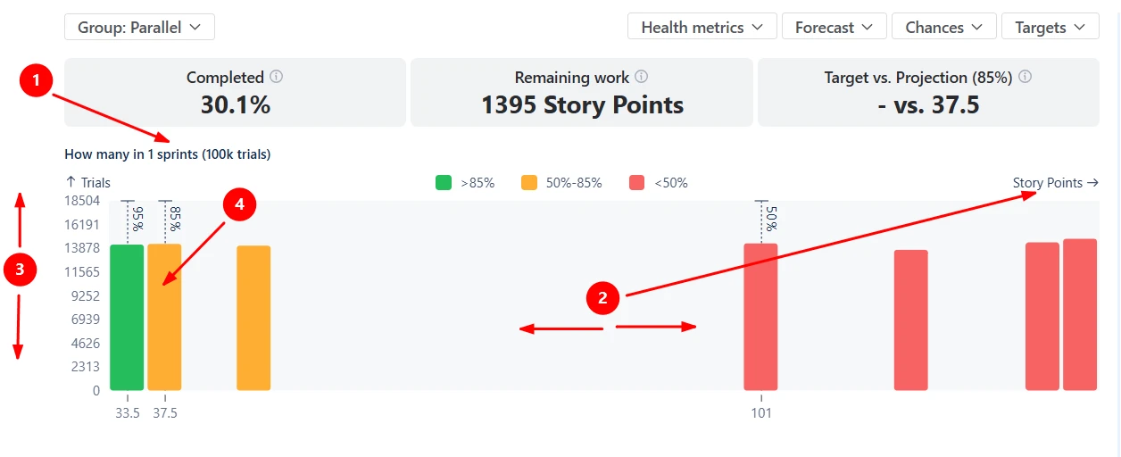 The Scrum Monte Carlo chart allows you to visualize delivery goals, such as release dates or scope commitments, directly in the forecast using Targets (1️⃣). Once a target is configured, the chart compares it with the simulation results and calculates the Target vs Projection health metric (2️⃣).