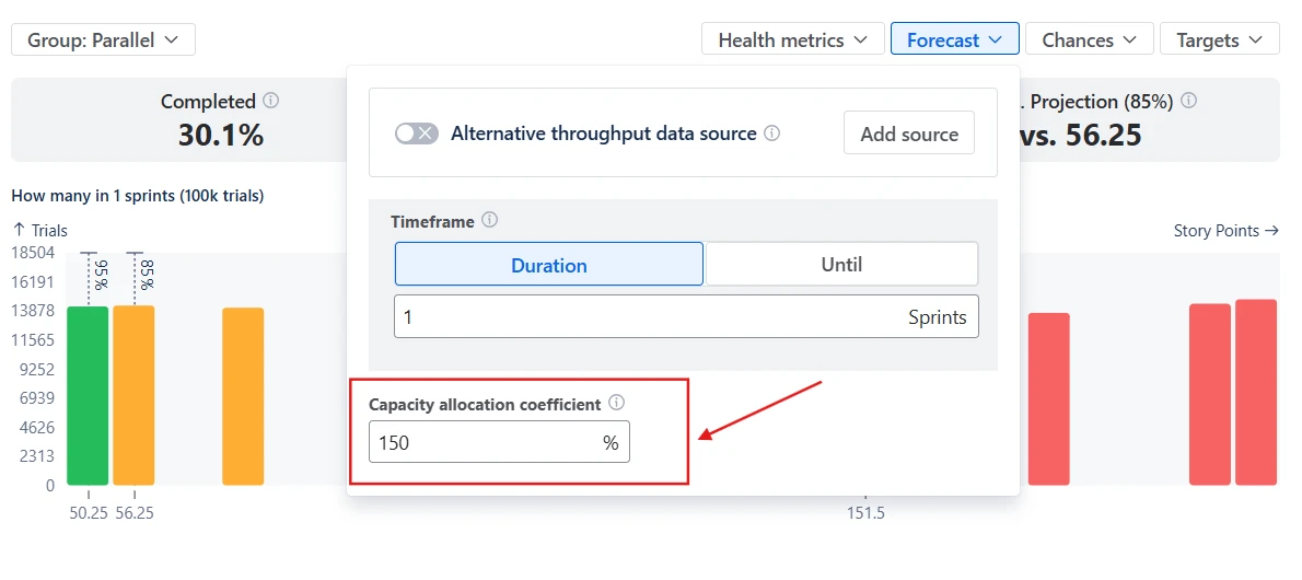 The Capacity allocation coefficient represents how much of the team’s throughput is dedicated to the selected work. A value of 100% assumes the team focuses entirely on this backlog, while lower values simulate situations where the team splits effort across multiple initiatives: