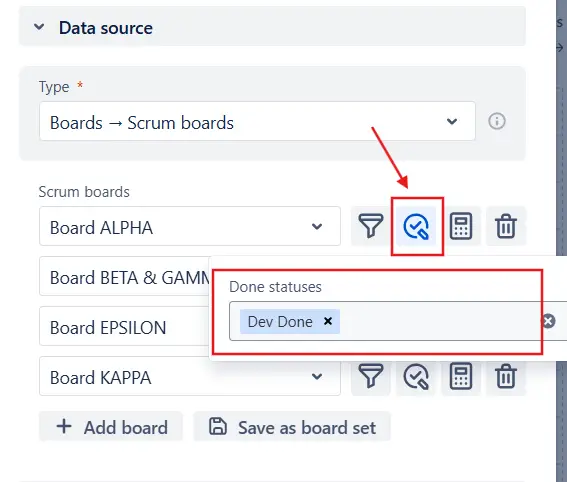 Define which statuses count as completed work per board, respecting different workflows while keeping results comparable.