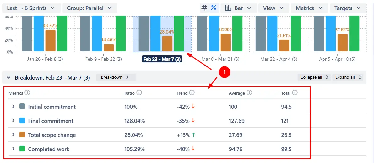 The Planned vs actual graph goes beyond high-level metrics by letting you open the Breakdown table for any sprint or interval (1️⃣). For each metric (Initial commitment, Final commitment, Total scope change, Completed work), you can see: