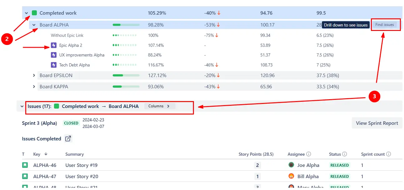 You can expand results into two configurable levels of nesting - for example, by board → epic → issue type (2️⃣) - and then explore the issue list to trace metrics back to individual items and team contributions (3️⃣):