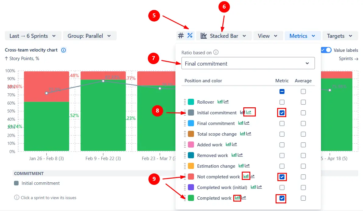 Metrics in stacked bar: Completed work + Not completed work (9️⃣)