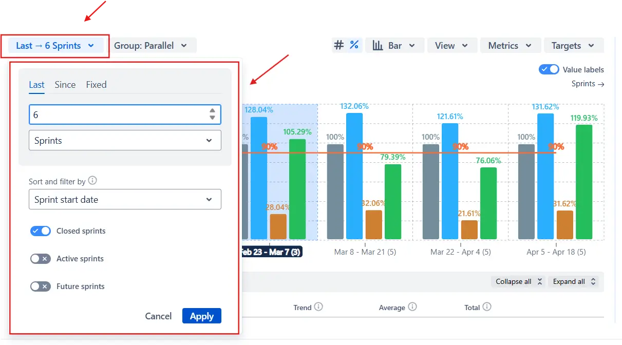 Last – show a set number of past sprints or a time-based interval (days, weeks, months, quarters).
