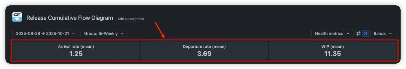 The Release cumulative flow diagram also provides a simple, intuitive way to monitor the overall health of your release without having to analyze every detail. At the top of the chart, you’ll find health metrics designed for quick understanding and decision-making. These three core metrics show the essential dynamics of your release: