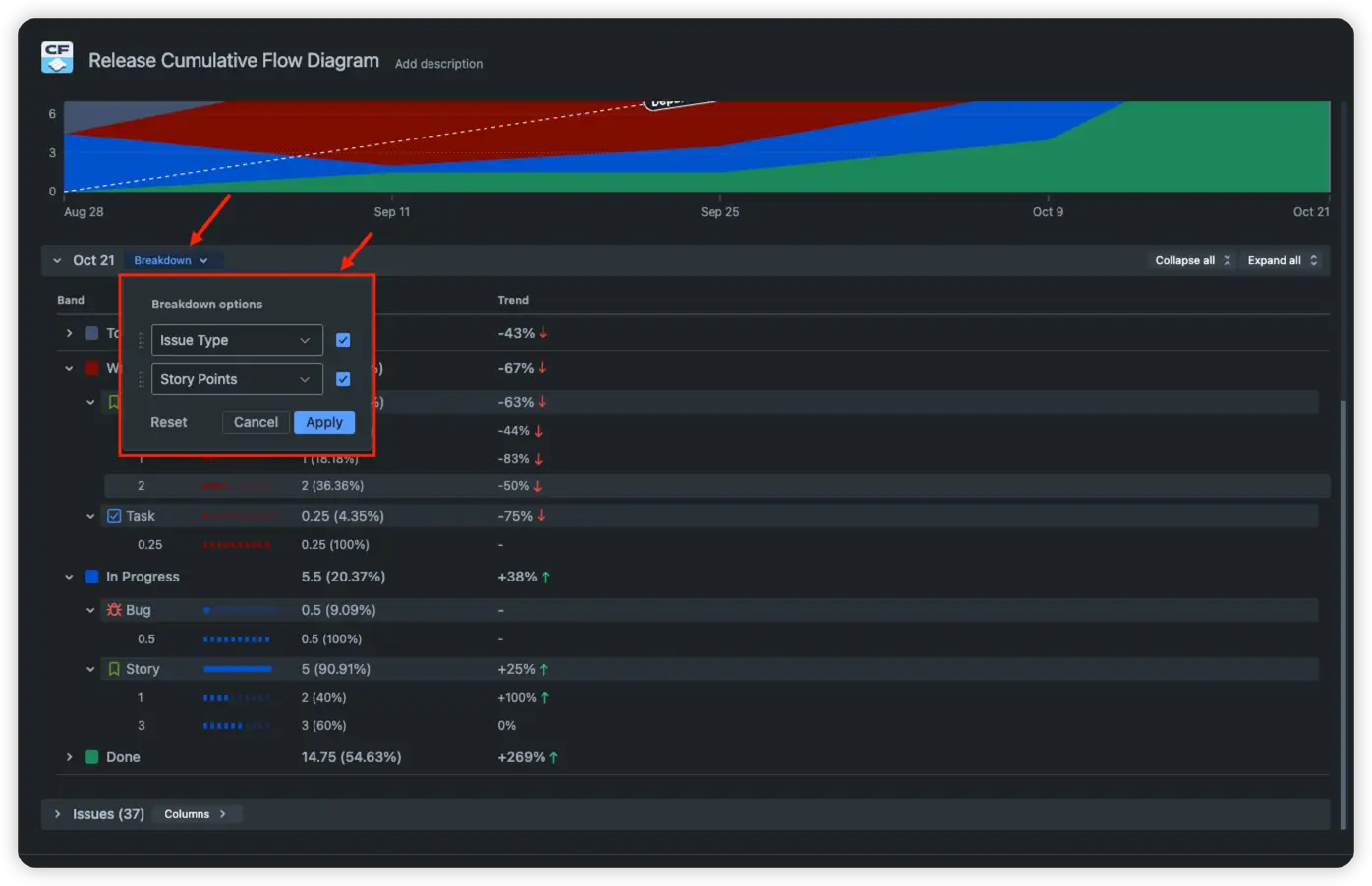 The Release cumulative flow diagram (CFD) provides enhanced customization options for how your data is displayed. One option is bands, which let you group individual statuses into higher-level categories that reflect your team’s workflow. To enable this functionality, select “Status groups” in the “Bands foundation” dropdown under the “Calculation” section of the chart settings.