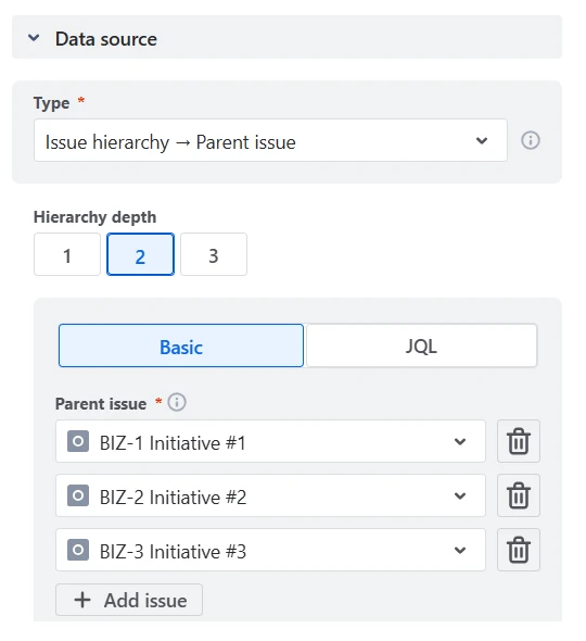 In the example below, the chart aggregates work items that sit two levels below the parent issues BIZ-1, BIZ-2, and BIZ-3: