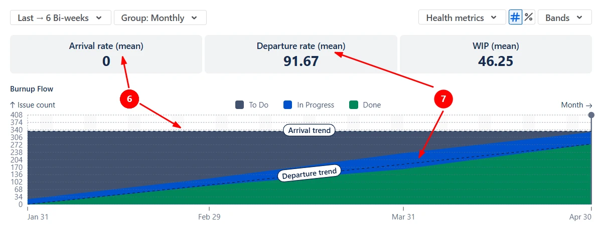 In Example B, the Arrival trend line remains flat with an average Arrival rate of 0 (6️⃣), while the Departure trend line steadily increases with an average Departure rate of 91.67 items per month (7️⃣). This indicates that no new work is entering the selected scope while the team continues to deliver consistently, reducing the total backlog over time. This is a healthy pattern if the team’s goal is to finish a fixed scope - the system is stable and winding down as expected.