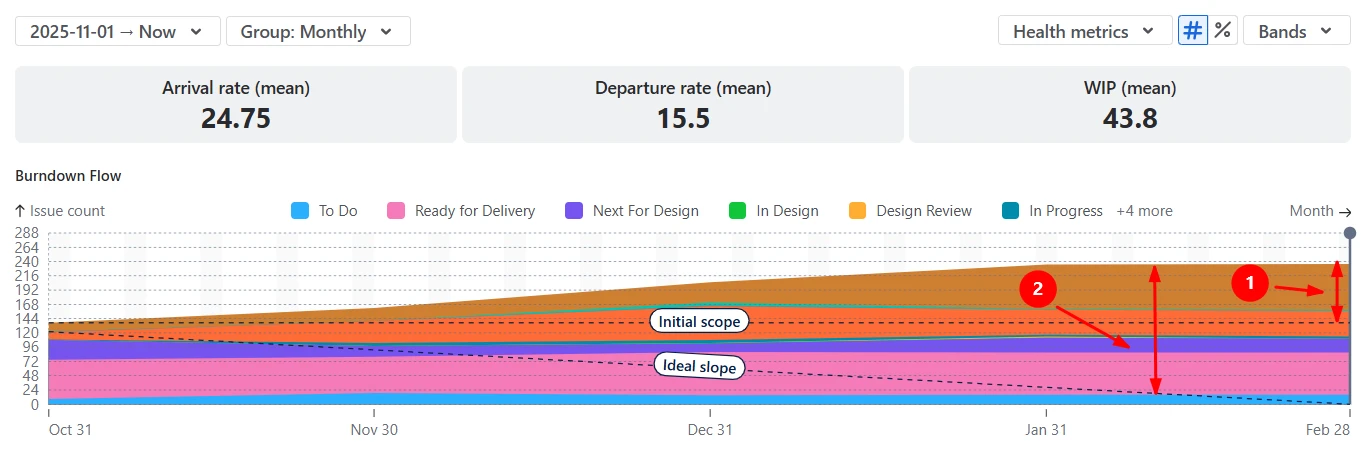 In the example below, the scope has grown from 144 issues to around 240 issues (1️⃣), significantly increasing the delivery load. Ideally, the portion of the flow above the Ideal slope line (2️⃣) should be concentrated in Done (or nearly Done) statuses. In this case, a large share of work remains in non-Done statuses, indicating that delivery is falling behind the plan.