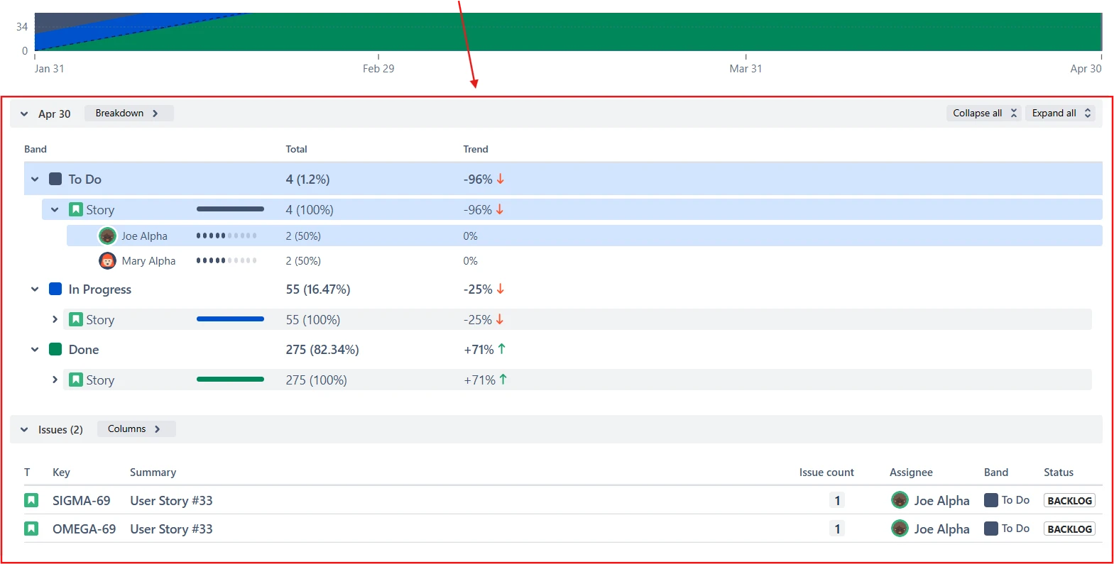 Use Breakdown and Issue list views to trace ART-level signals back to specific teams, work types, and Jira issues.