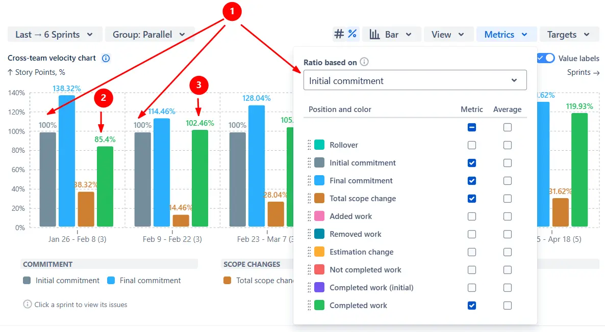 To spot trends in delivery consistency, the Say-do ratio chart allows you to display average lines for any metric. You can turn on the average line in the Metrics menu and choose the average type in the Calculation section: