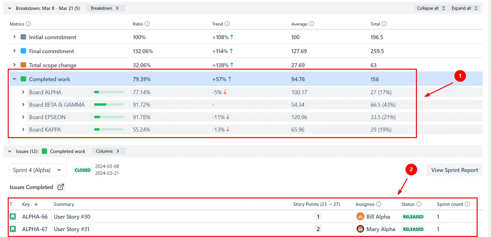 Click any sprint or interval on the chart to open the Breakdown view (1️⃣) and compare results across boards, projects, or issue types. From there, use the Find issues option to open the Issue list (2️⃣), where you can see the exact work items that contributed to each metric - complete with story points, assignee, and status: