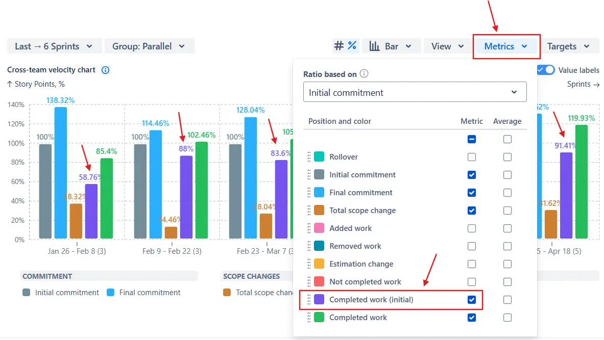 In addition to standard metrics like commitments and total completed work, the Say-do ratio report lets you display Completed work (initial) - the portion of the initial commitment that was actually delivered by the end of the sprint. You can enable this metric from the Metrics menu above the chart: