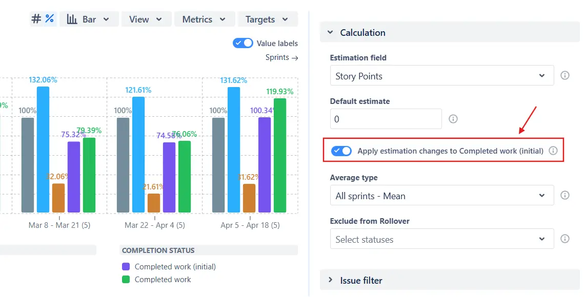 To fine-tune this metric, use the Apply estimation changes to Completed work (initial) toggle in the Calculation settings: