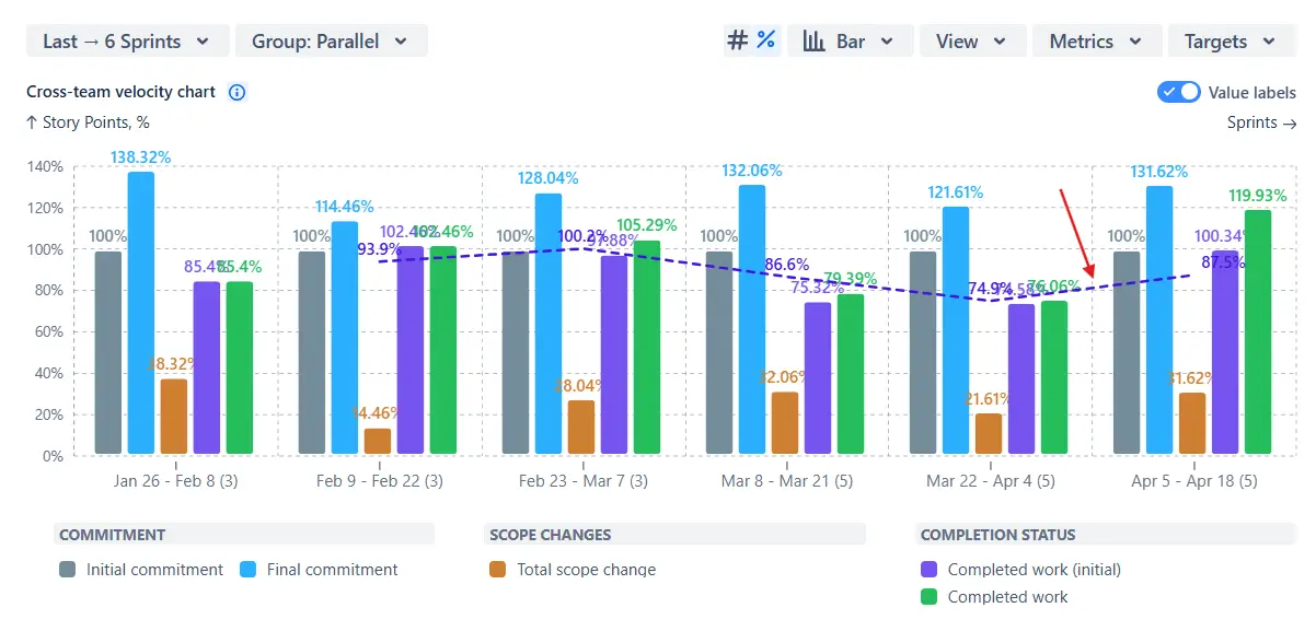 In the example below, the dotted purple line represents the moving average for Completed work (initial). While the values fluctuate between sprints, the average line highlights a gradual downward trend in commitment reliability, signaling the need to review planning and estimation practices: