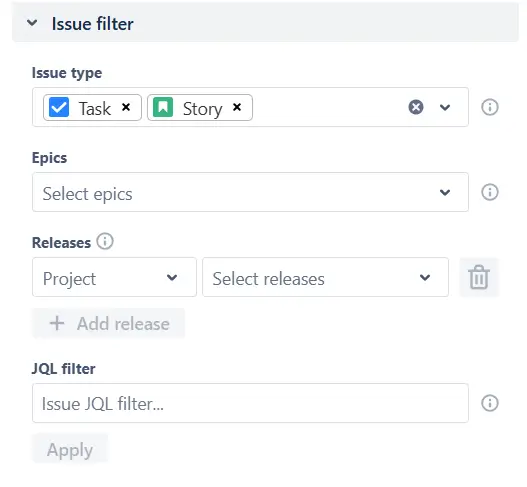 ✅ Filter by issue type, epic, release, or custom JQL to analyze only the data that matters.