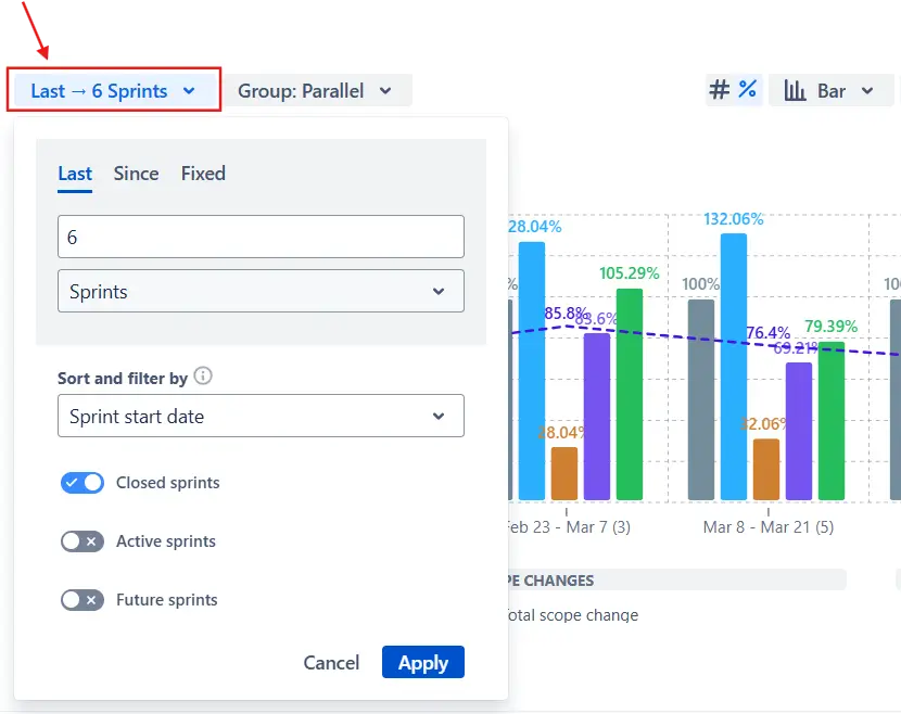 ✅ Pull data from multiple Scrum boards or projects into one chart to evaluate how reliably different teams deliver within the same release or Agile Release Train.