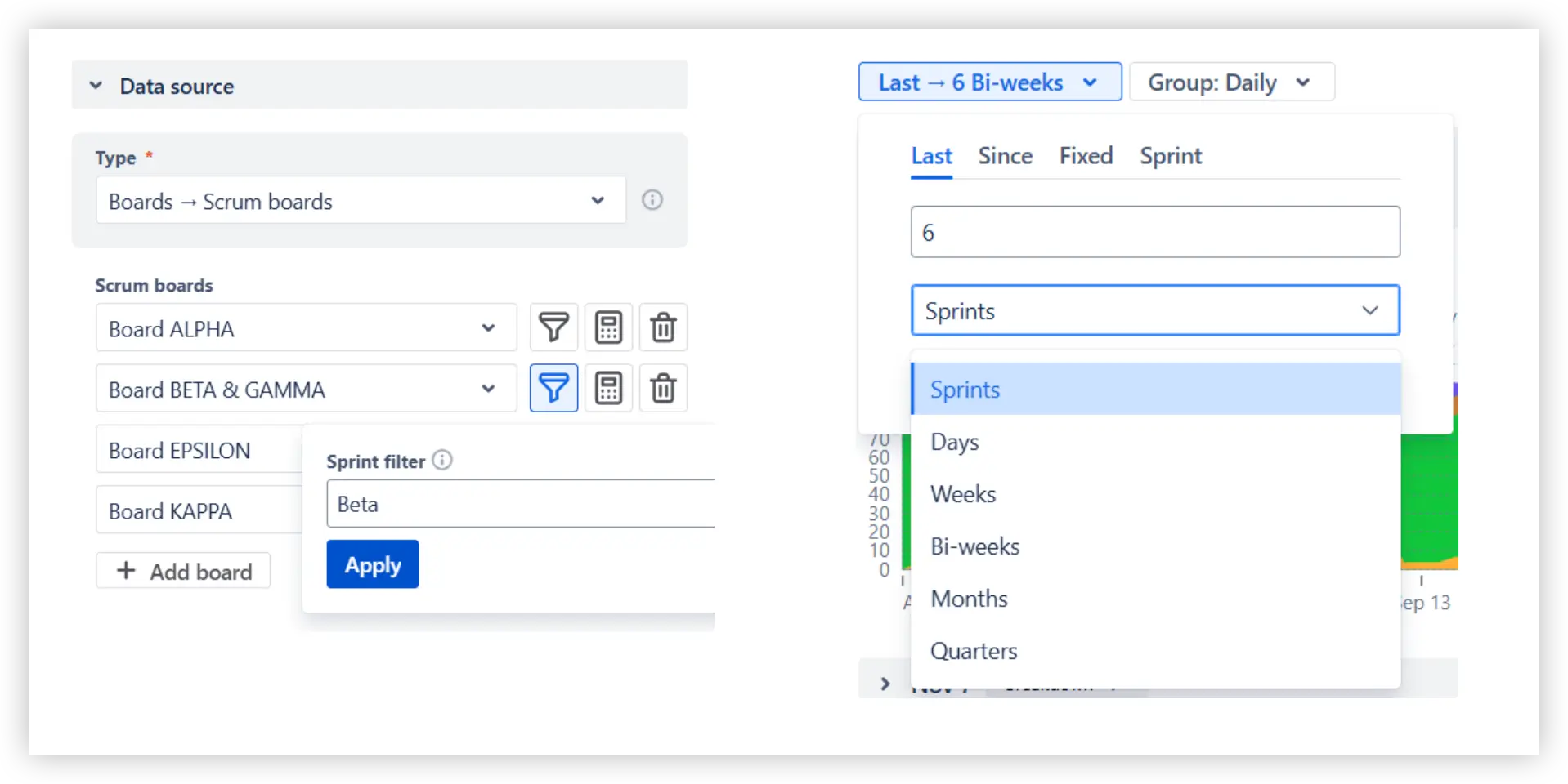 You can also control the time window: show the last N sprints, focus on a fixed date range for PI-level analysis, or display a specific sprint.