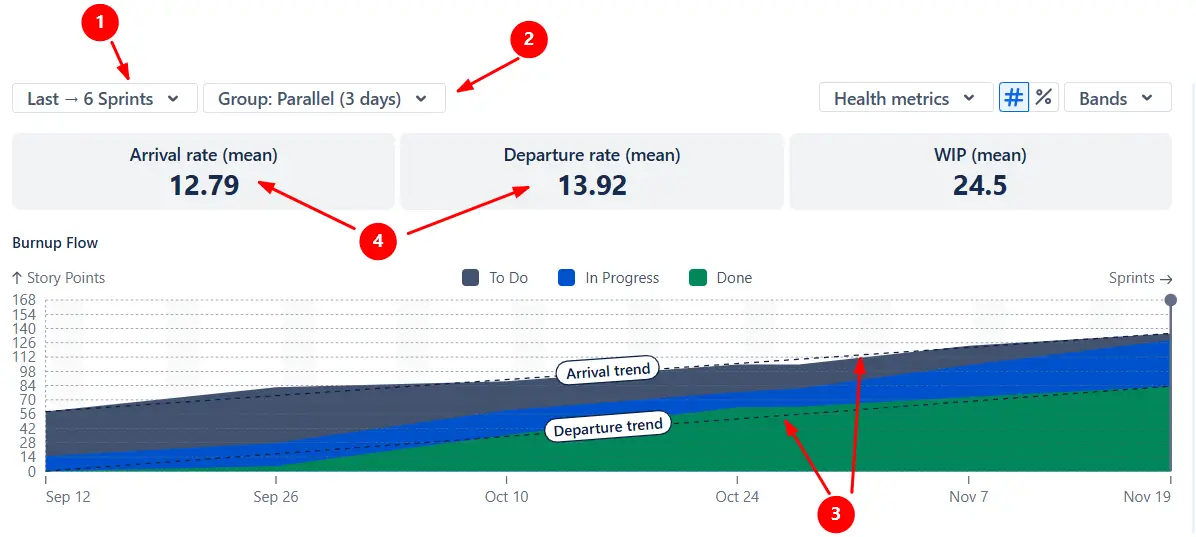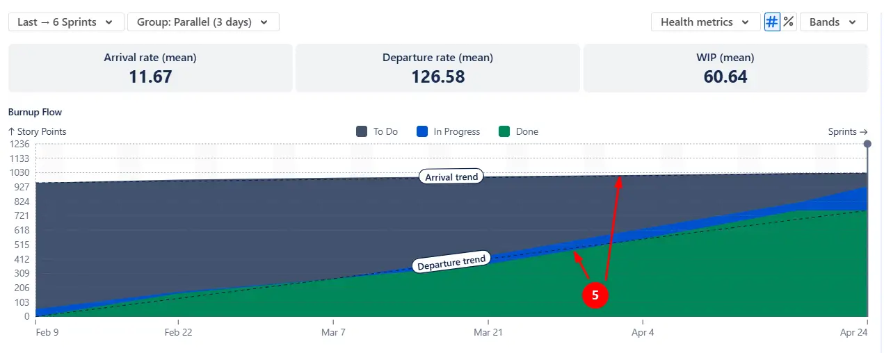 At the beginning of a planning cycle, we recommend using the Burnup Flow view to focus on how much work is being completed over time. Trend lines for Arrival and Departure help you compare how much work is added versus finished in each sprint. When these lines remain close, the team delivers at a predictable pace. When Arrival outpaces Departure, the backlog grows - an early sign of scope creep.