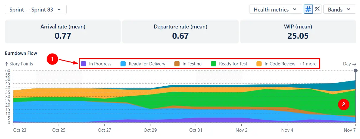 To understand exactly where work slows down during the sprint, switch the Scrum Cumulative Flow chart to show a separate band for each status (1️⃣). This view helps you pinpoint the stages where tasks accumulate - whether they wait too long in QA, sit in Review, or stall in Waiting for client.