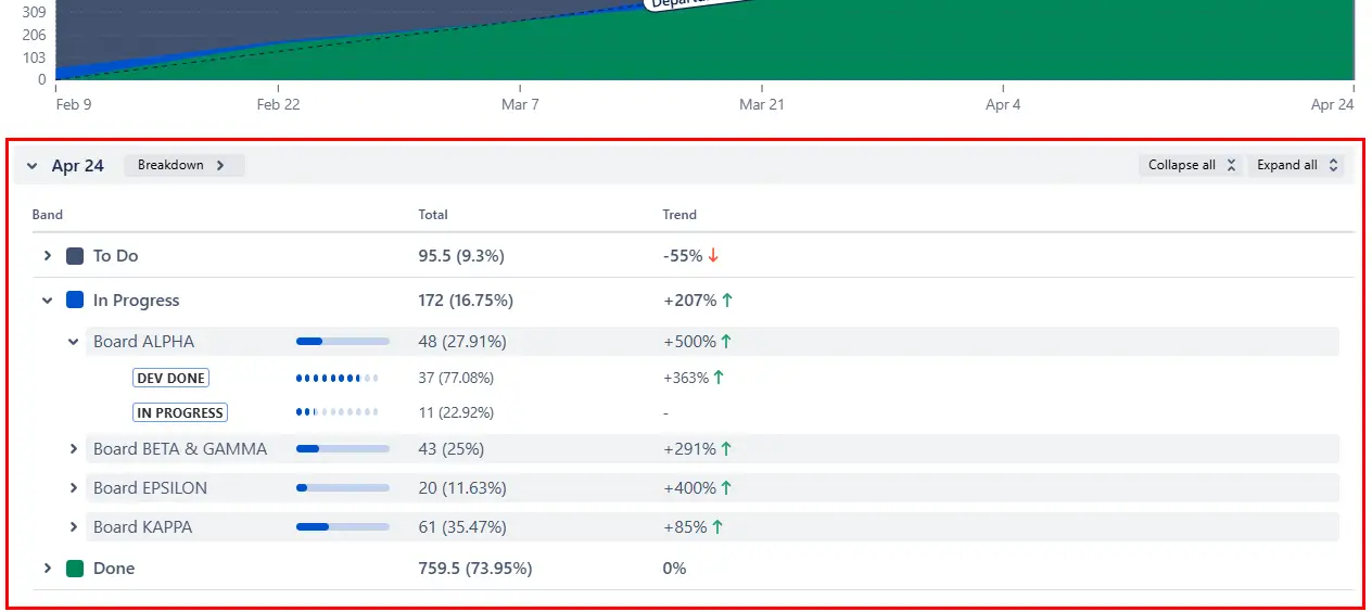 At any point in the sprint timeline, you can open the Breakdown view to see what’s behind the chart. The table shows how many items sit in each band (To Do, In Progress, Done) and lets you slice the data by board, team, epic, issue type, or any other Jira field. You can apply up to two levels of segmentation to compare teams, work types, or epics: