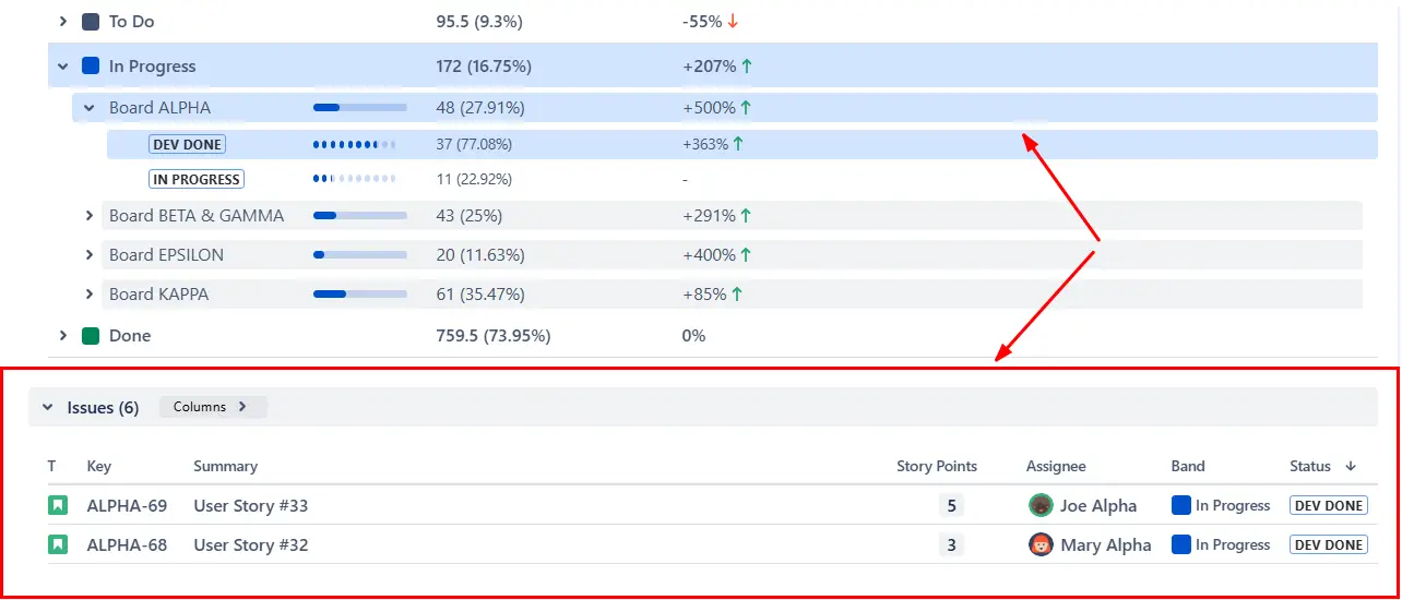 From there, selecting any row brings you to the Issue list, where you can examine the specific items contributing to each data point. You’ll see their statuses, story points, assignees, and direct Jira links: