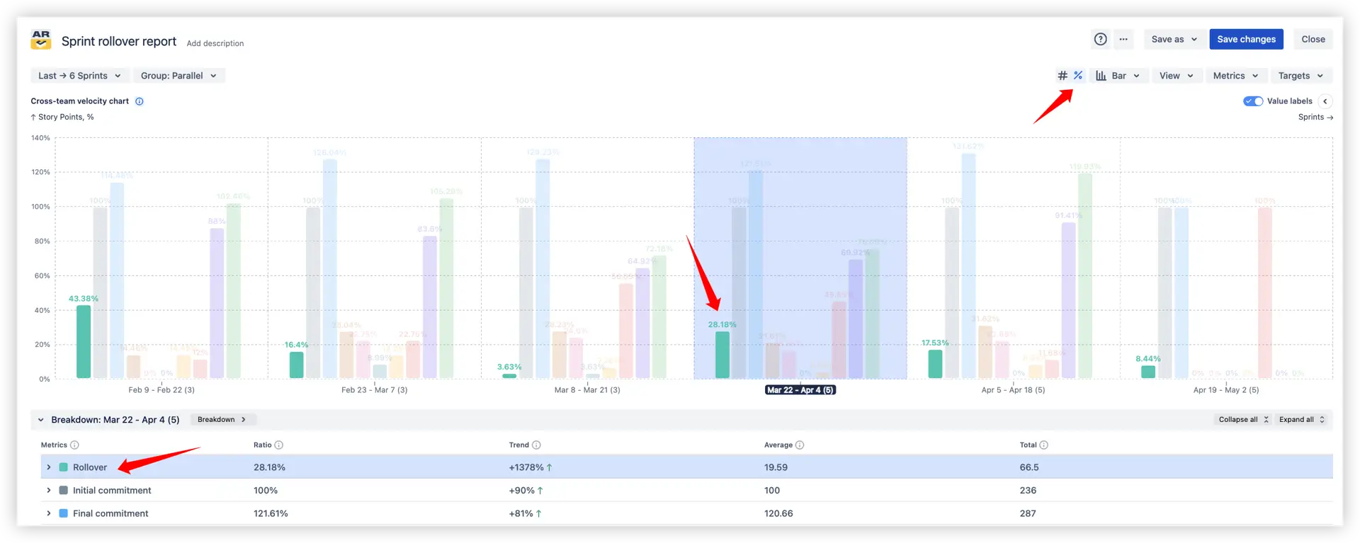 Switch the chart to percentage mode to analyze rollover in relation to your team’s total commitment - not just in absolute story points.