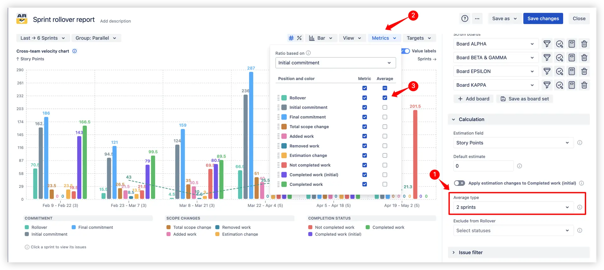 Apply filter by rollover metric (1️⃣) to better focus on unfinished work carried over into the next sprint.