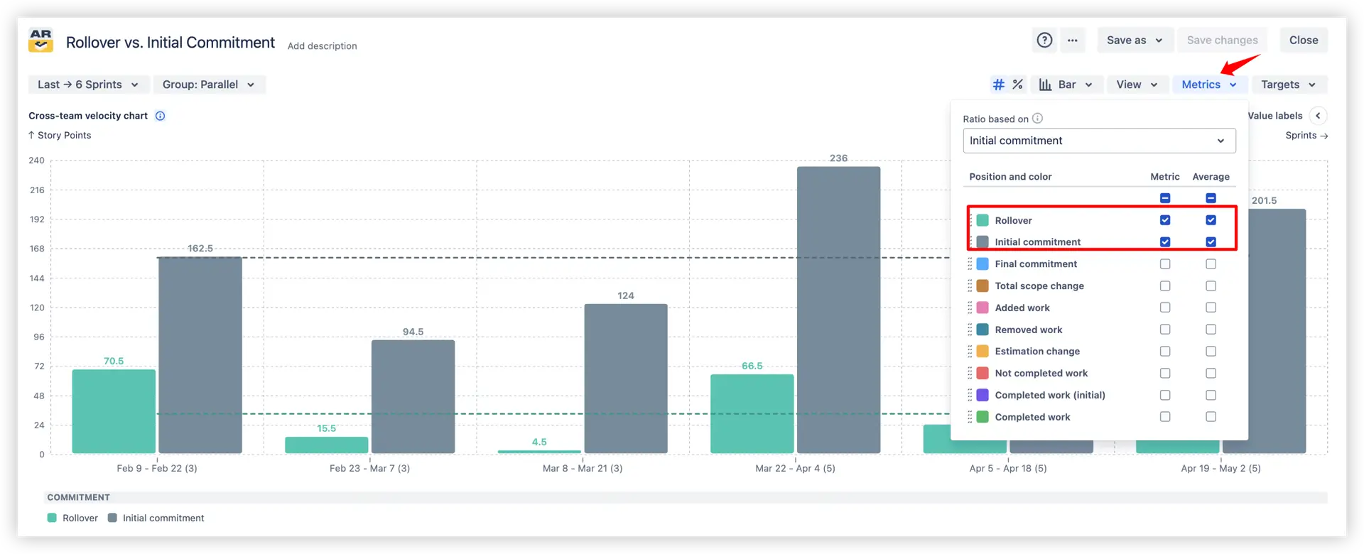 Jira sprint rollover vs initial commitment setup in the Metrics panel