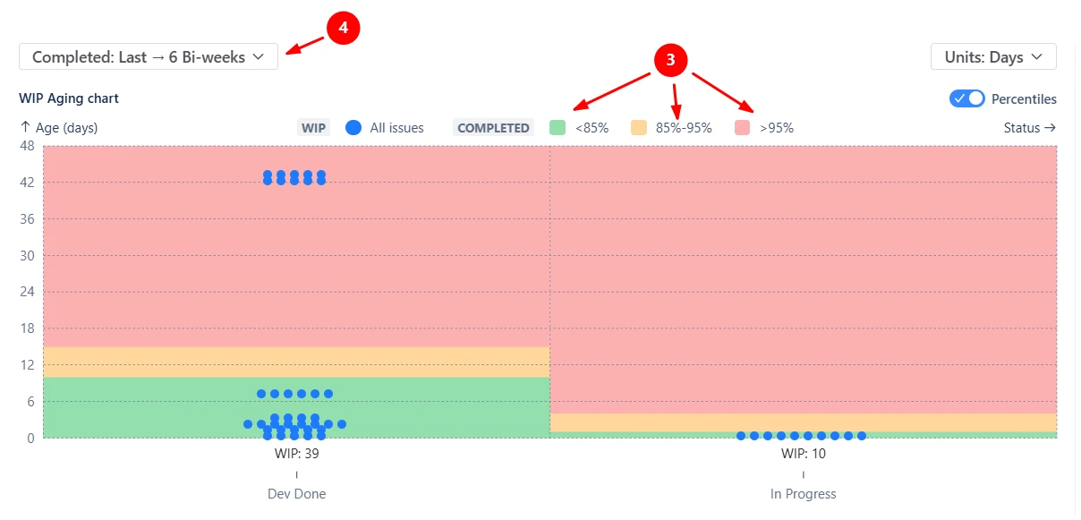 Percentile highlights allow you to compare the age of current work items against the historical performance of completed issues, helping you quickly identify items that are aging beyond expectations.